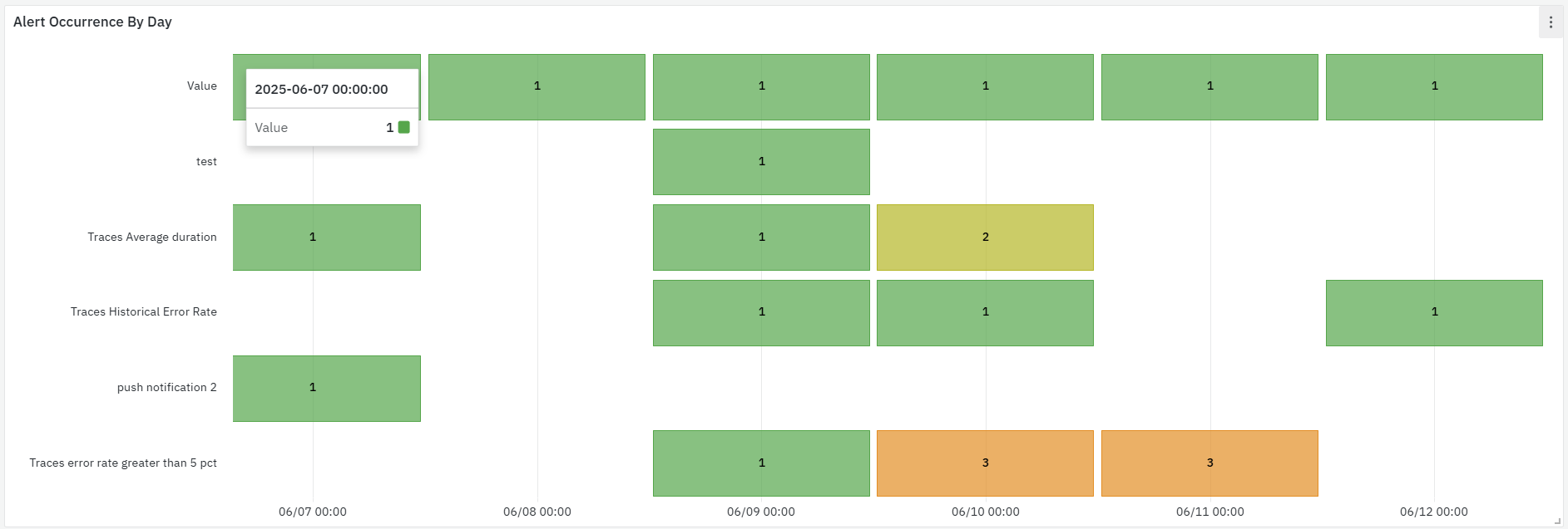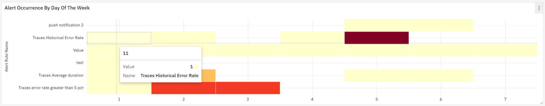• The color intensity reflects the frequency of each alert type, allowing teams to quickly spot which alerts are more frequent and on which days.