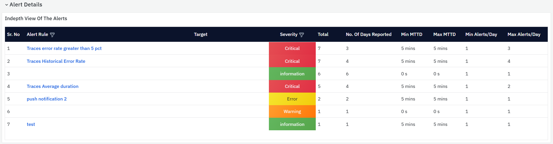 • This table provides a comprehensive breakdown of different alert rules, including their severity, total occurrences, and performance metrics: