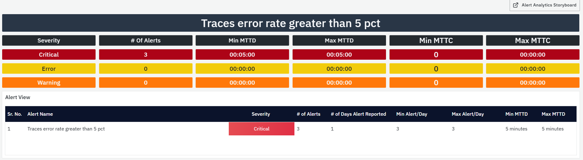 • Min MTTD (Mean Time to Detect) and Max MTTD: The shortest and longest times taken to detect the alerts.