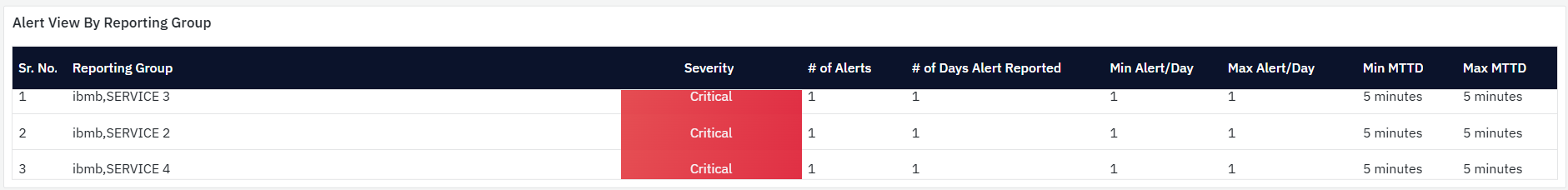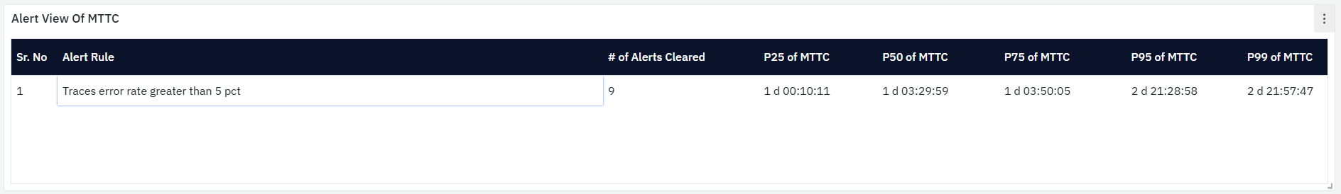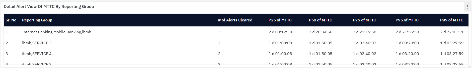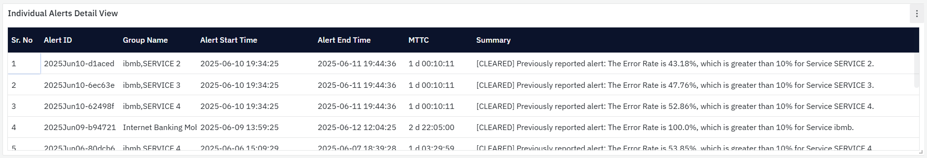 • Alert ID, Group Name, Alert Start Time, Alert End Time, MTTC, Summary: Detailed information on each alert, including when it started and ended, and the time taken to clear it.