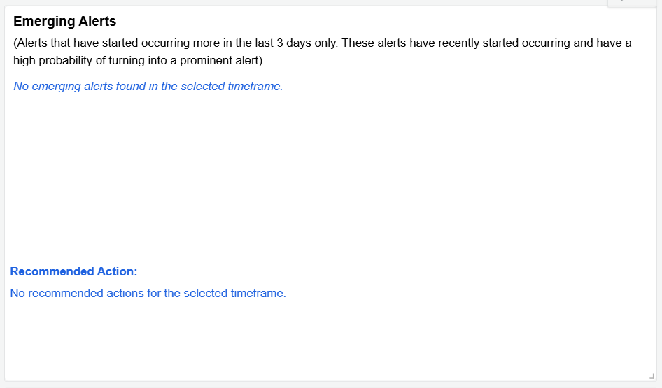 Alerts that have recently started appearing more frequently in the last 3 days. These alerts, while not currently significant, have the potential to become prominent if left unaddressed. No emerging alerts were found in the selected timeframe, so no immediate actions are necessary.
