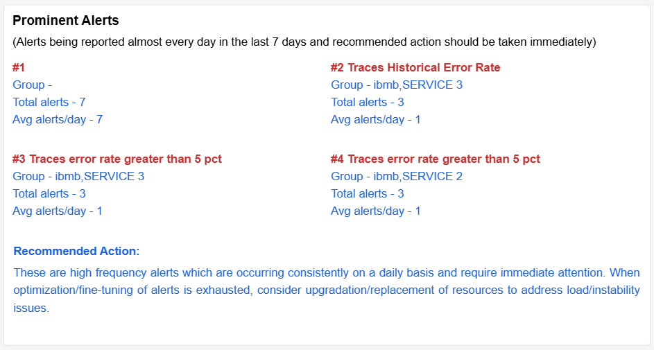 • Immediate attention is recommended to address these alerts to prevent potential issues. Investigate and fine-tune alert settings, optimize resource allocation, or consider infrastructure upgrades to mitigate these recurring alerts.