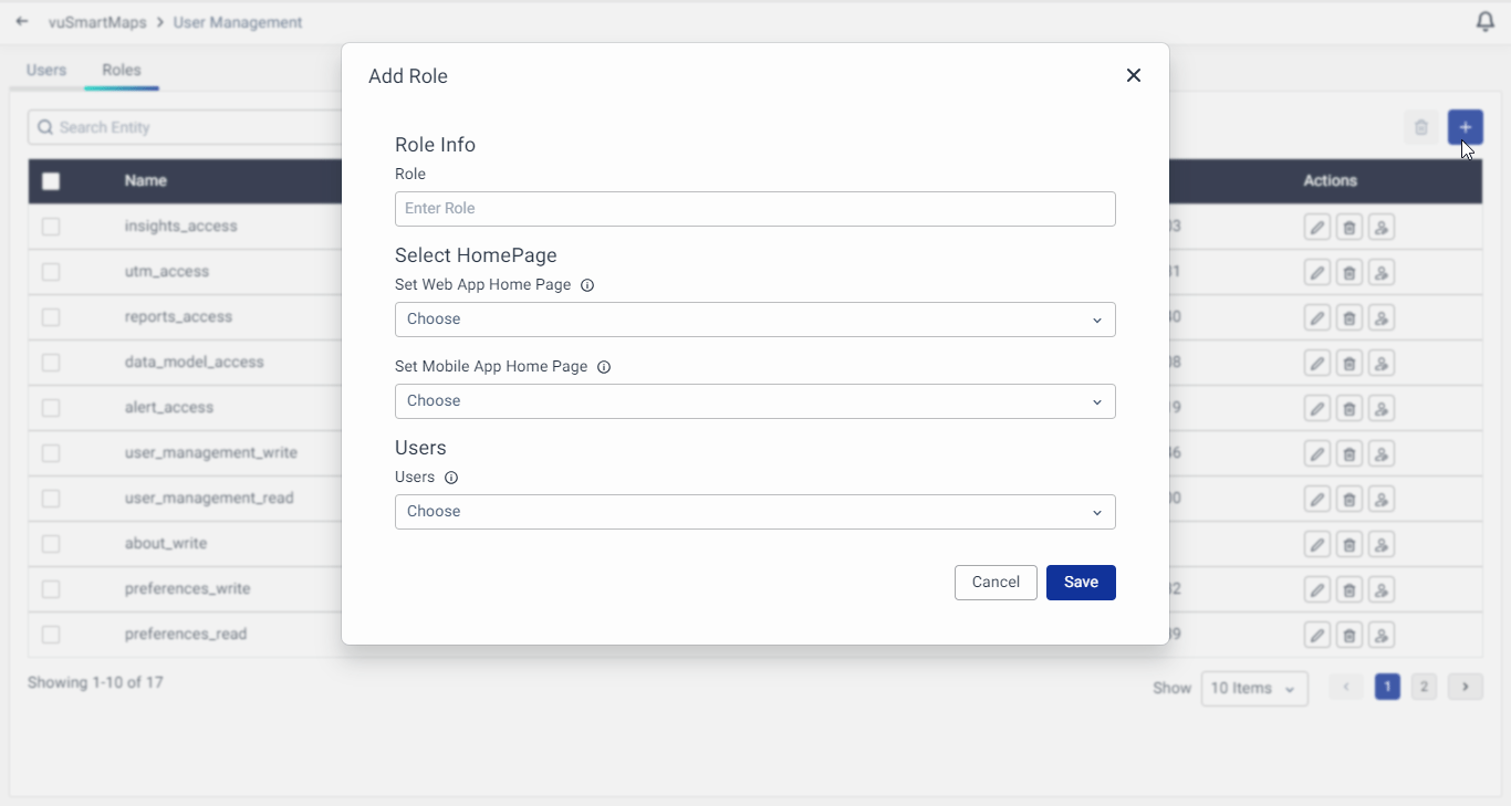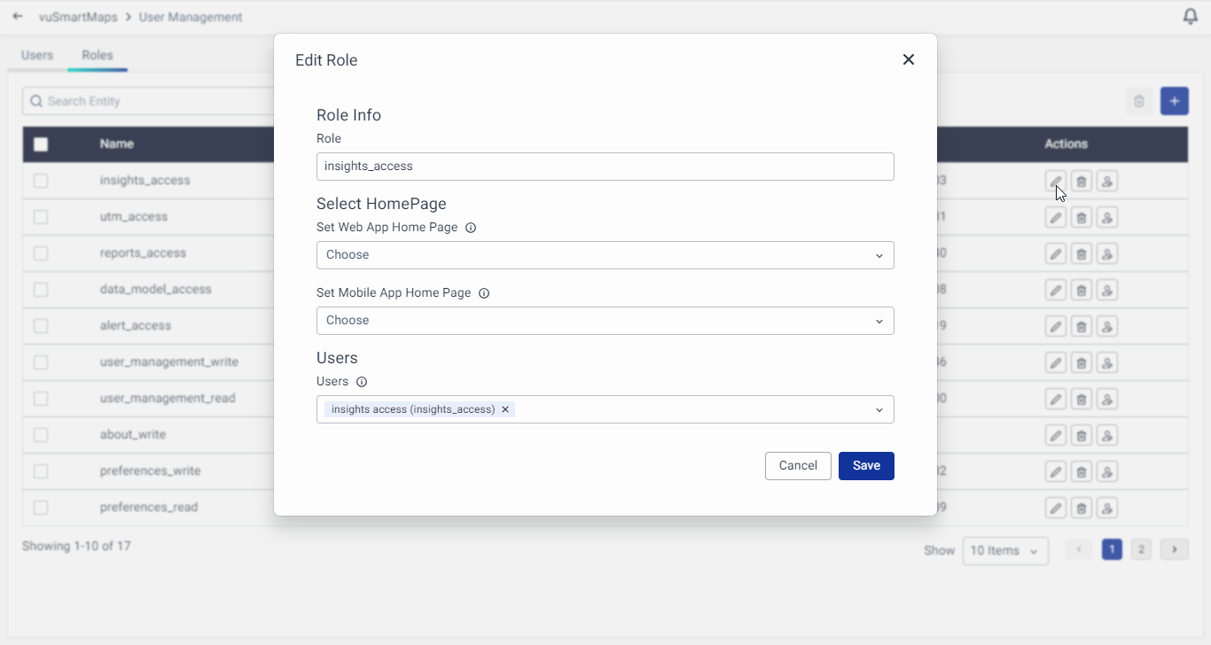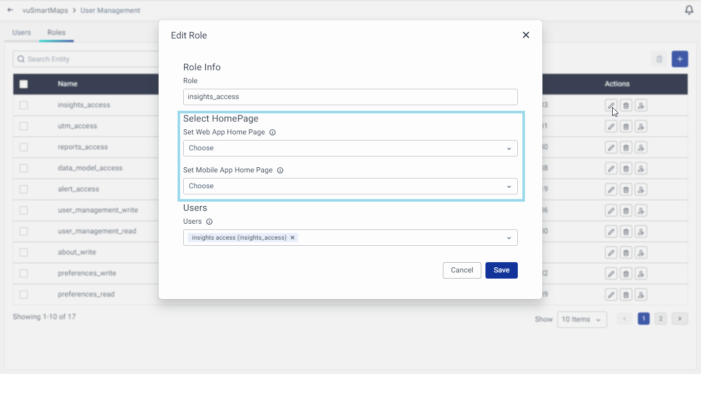- On clicking the Edit button, a pop-up will open, where you can modify the preference for the homepage for the web app and mobile app under Select HomePage. Similarly, Users can also be updated for the role from this pop-up on the Edit screen. Clicking Save will update the details for the specific role.