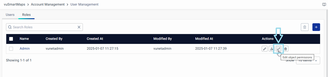 To assign permissions to a Role, select the Role to which you want to grant permissions and click on the Edit Role Permissions icon, as shown below: