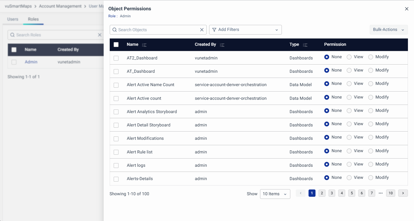 - Administrators with the permission of manageBulkObjects can bypass standard RBAC restrictions and list all objects for permission assignments. However, objects that are associated with the admin’s own modules will only be visible or manageable if the admin has been explicitly granted access to those objects.