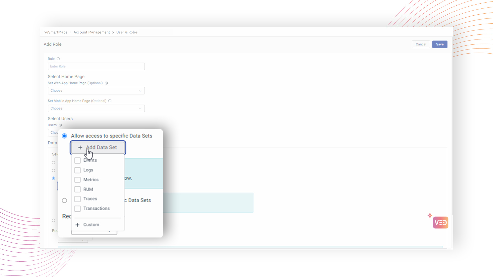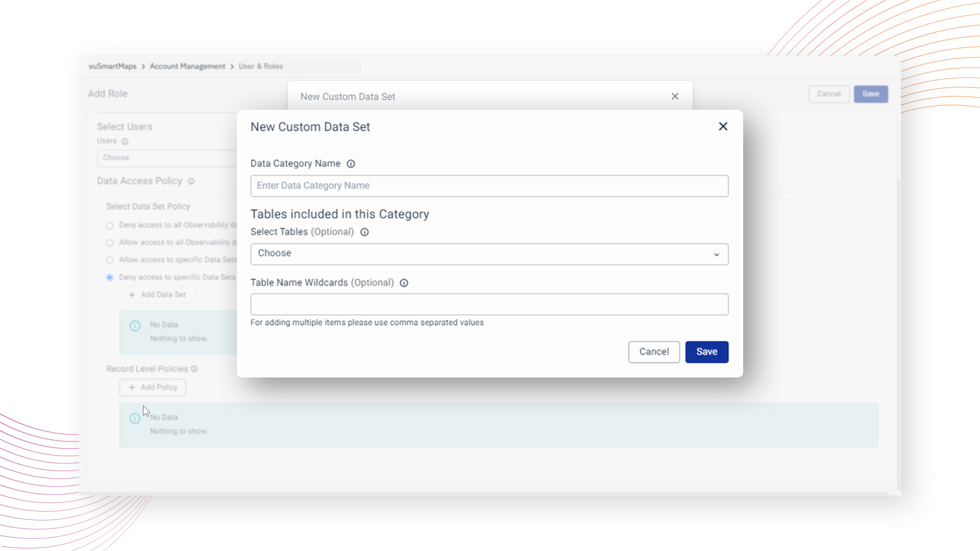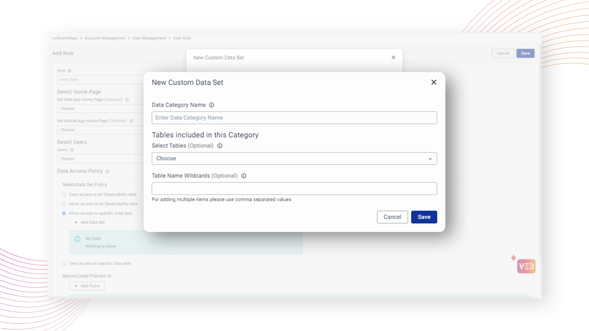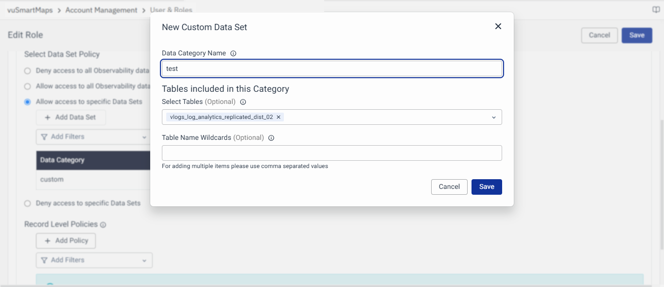 In cases where a "Custom" category is chosen, users are provided the flexibility to create a custom category with a designated name and specify tables to be denied access. vuSmartMaps diligently enforces these access restrictions, actively preventing users associated with the configured role from accessing the restricted datasets.