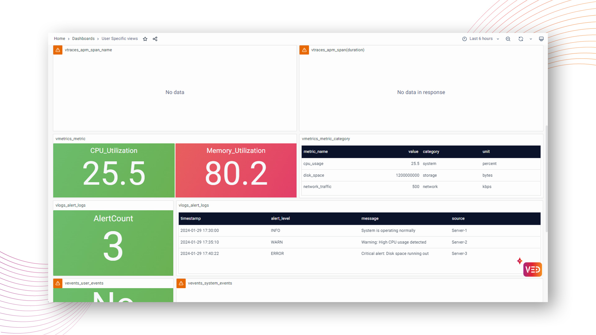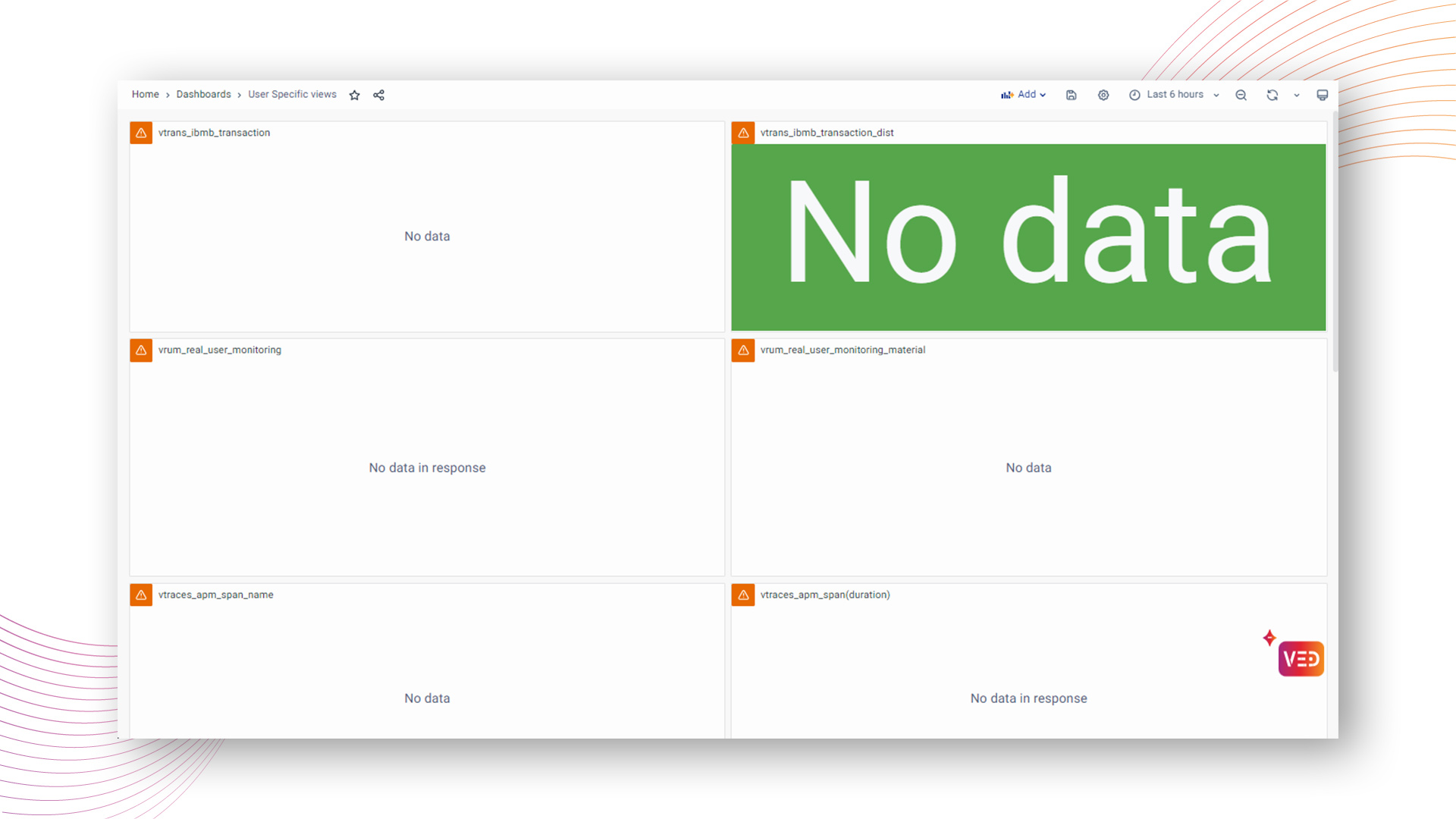 In this case, the user mapped to this role will be unable to access any observability data. The resulting dashboard will display no data, showing the restricted access enforced by the specified data policy.