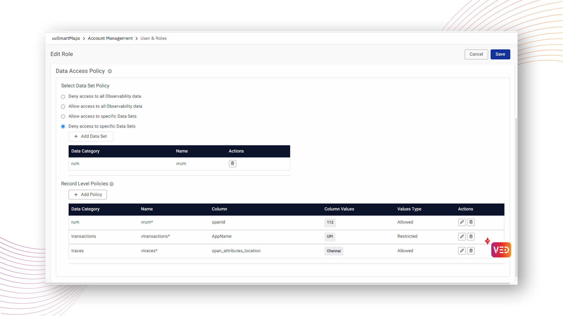 Consider a scenario where the role denies access to the "rum" data category. Record level policies are then configured to allow access for "span id 112" in "rum," restrict access for "appname UPI" in "transactions," and allow access for "span attribute location chennai" in "traces”.
