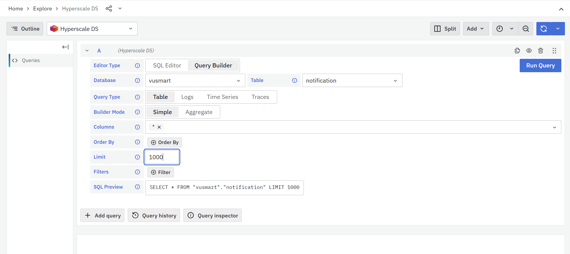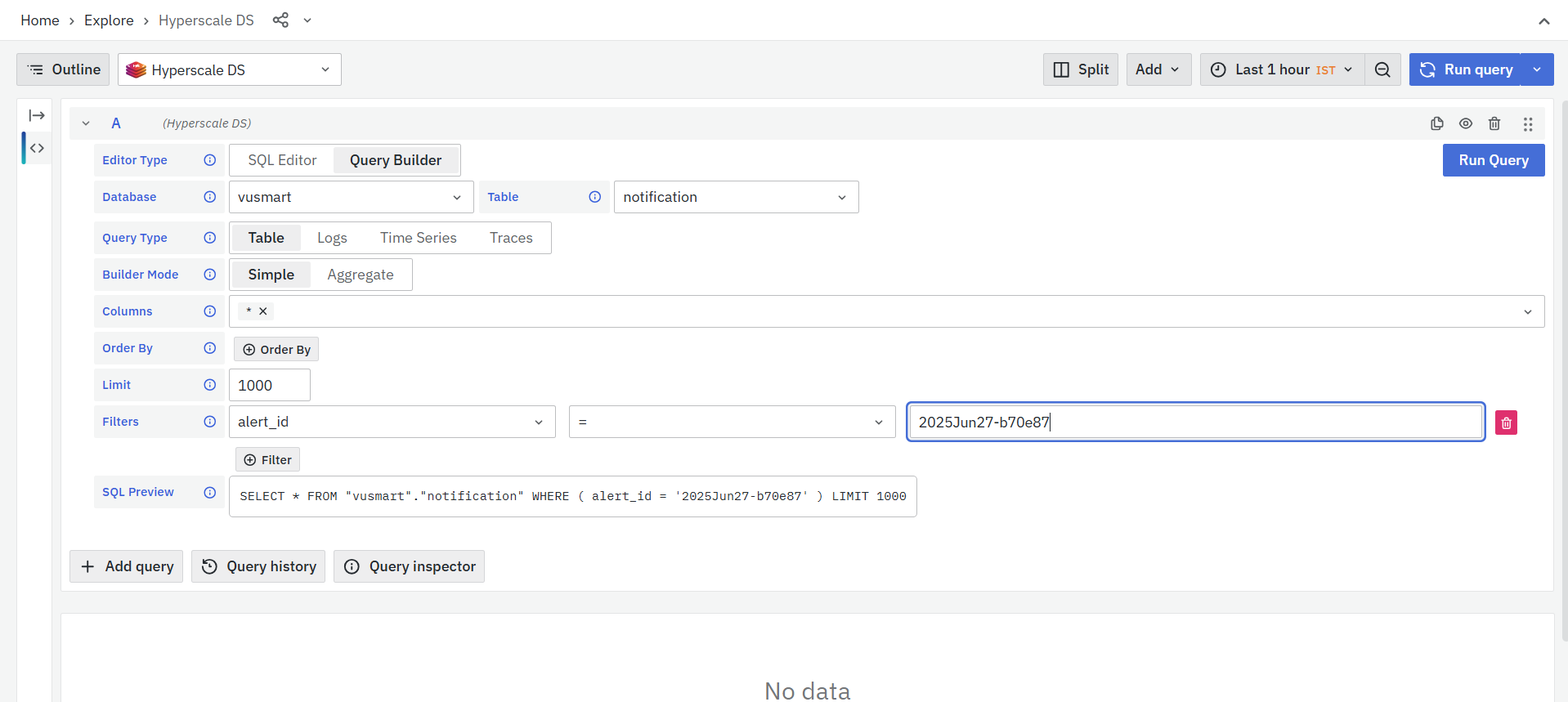 In the Explore panel, start by setting the Editor Type to Query Builder. Then, under the Table dropdown, choose the notification index that corresponds to the alert you want to retrieve.