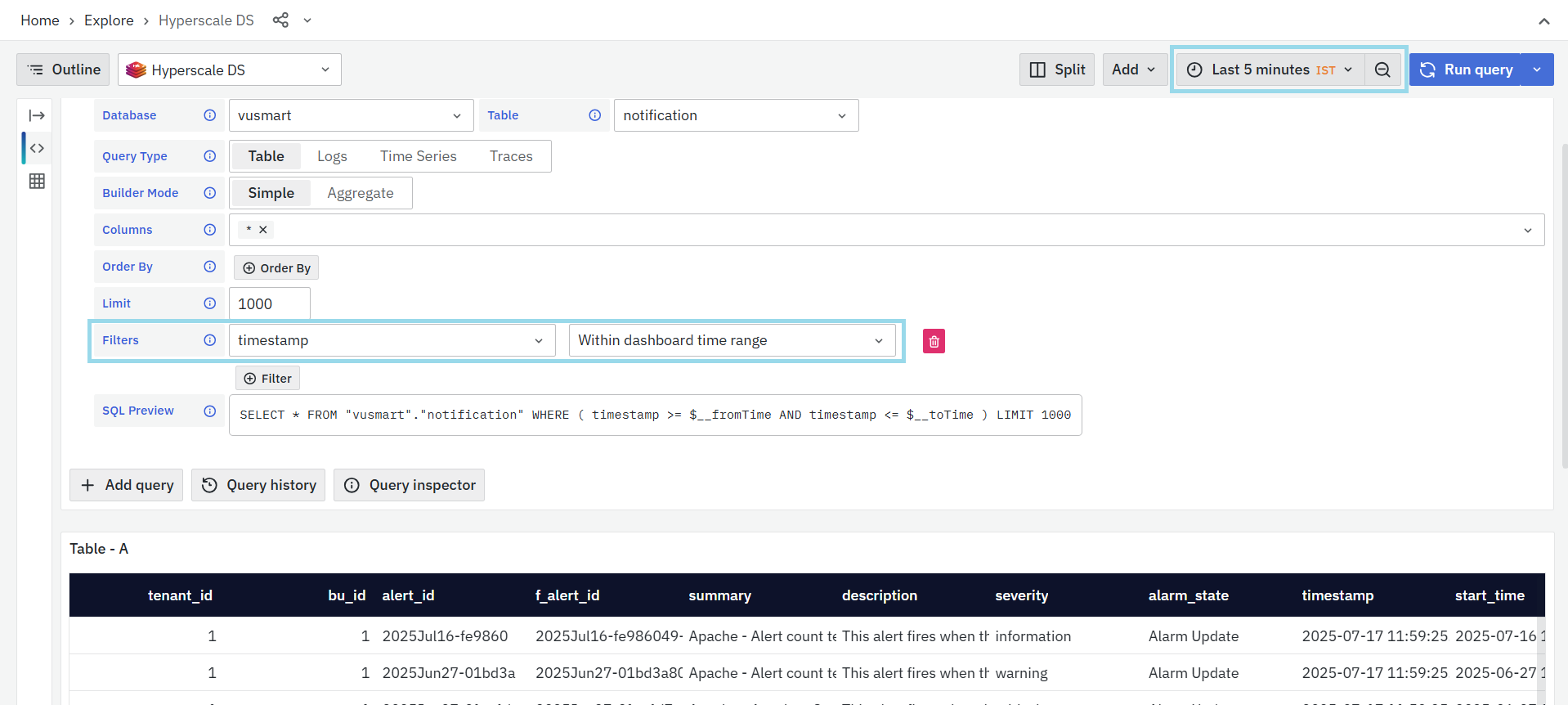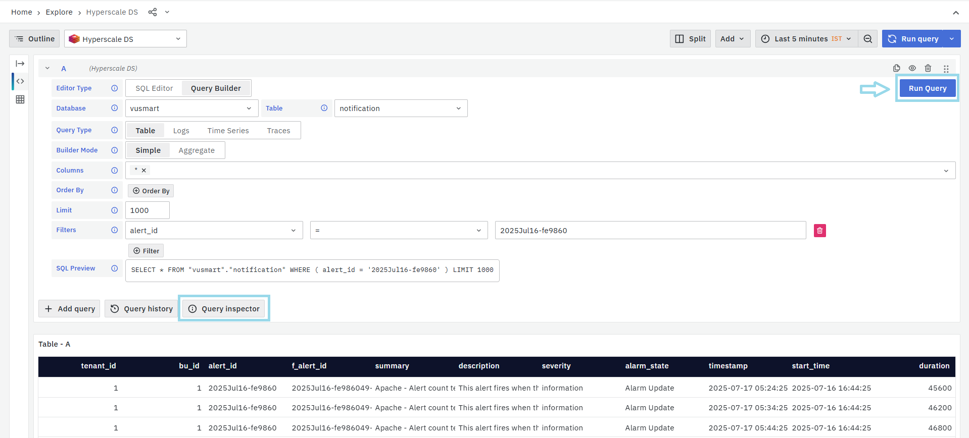 Click the Run Query button to fetch the matching Alert Table. The resulting data will appear in the preview table located below.
