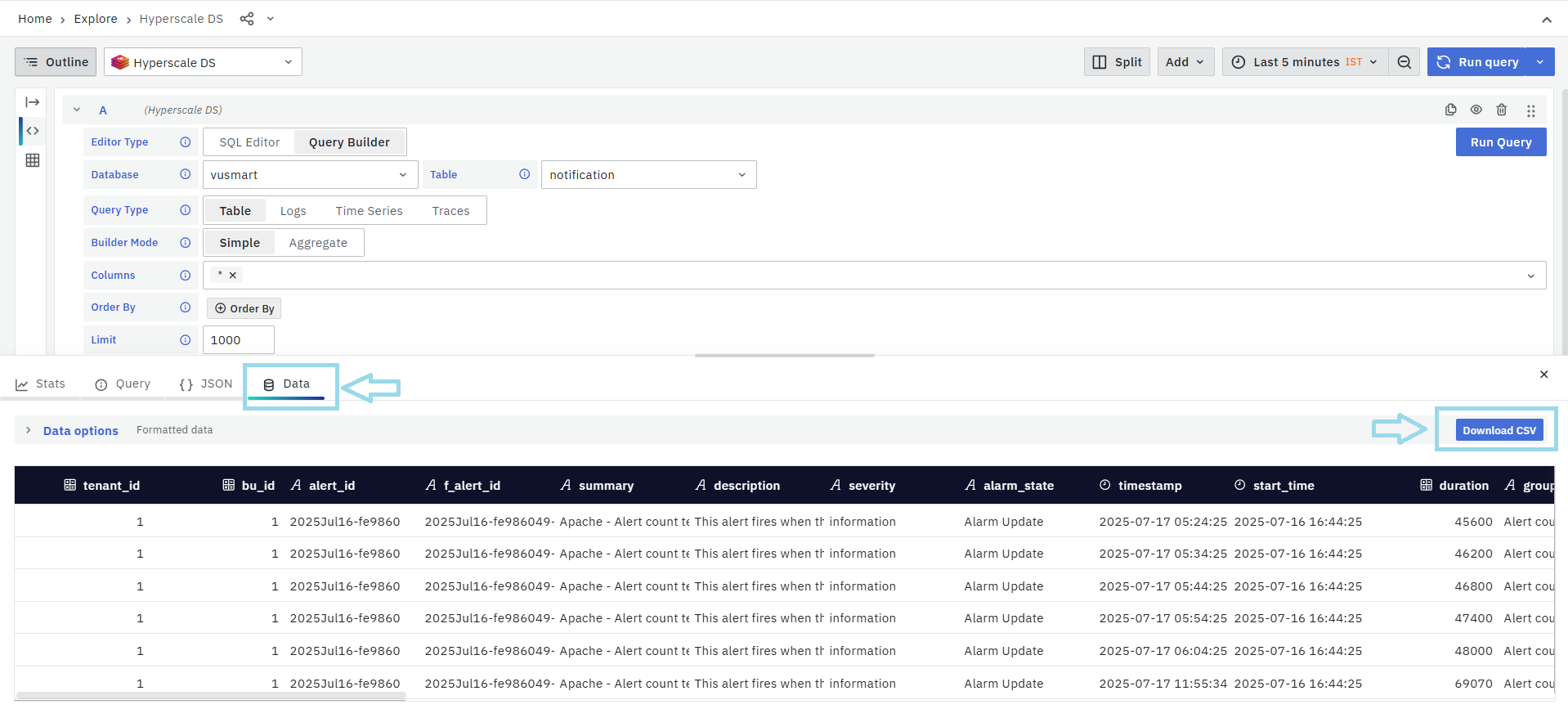 Inside the Data tab, click on Download CSV to export the alert data. The file will be downloaded to your local system in CSV format.
