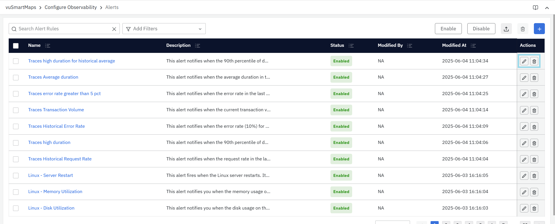 - Listing Alert Rules Configured: You can view the names, descriptions, status, creation, and modification details, and perform actions like editing or deleting alert rules conveniently from this list