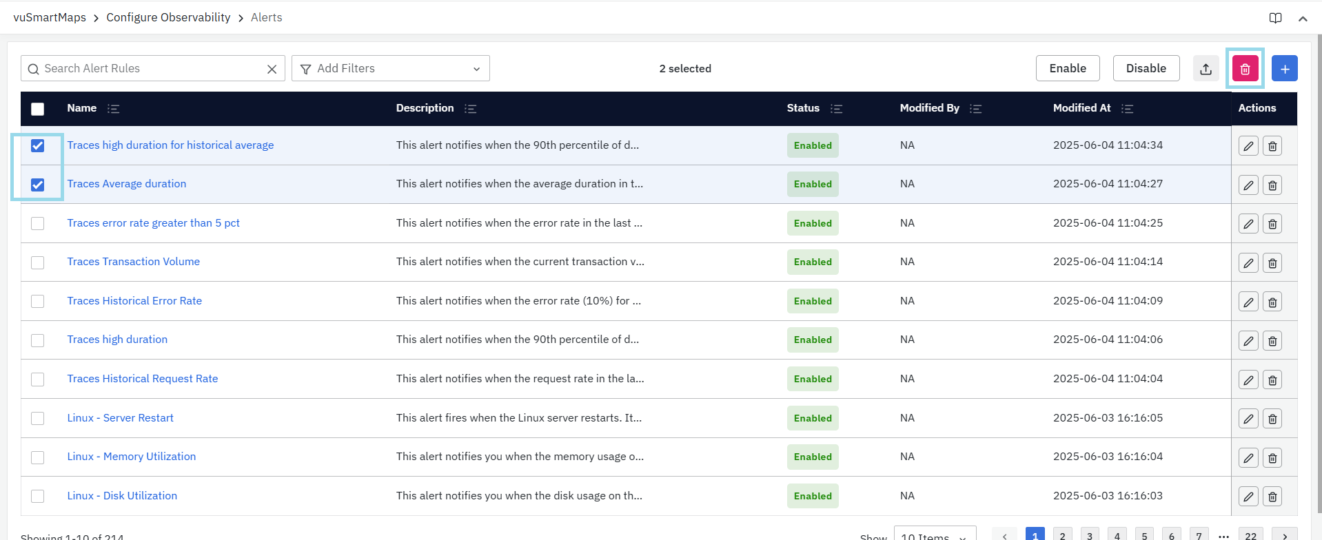 Multi-Delete: Select one or more Alert Rules and click the Delete button at the top right.