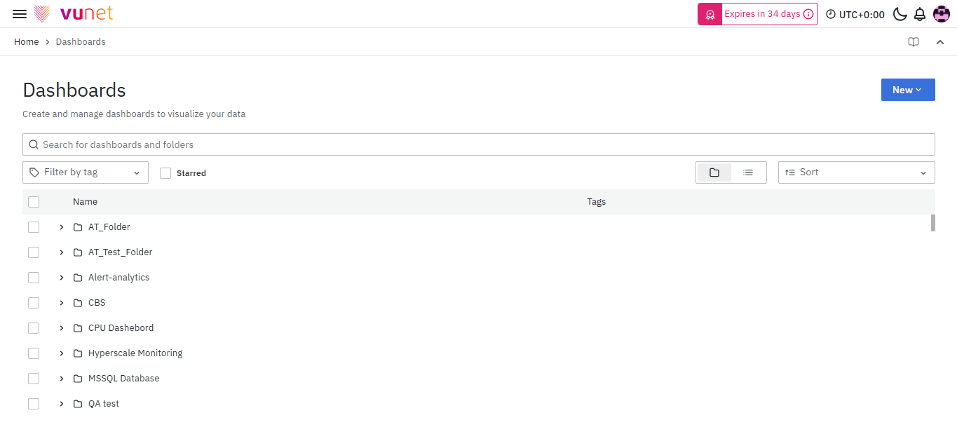 To create a new dashboard, open the Left Navigation Menu, go to Dashboards, and click New -> New Dashboard. For detailed steps, refer to the Create a New Dashboard section.