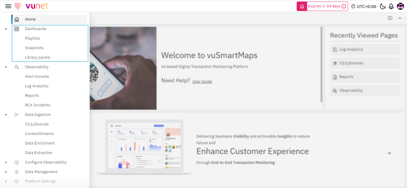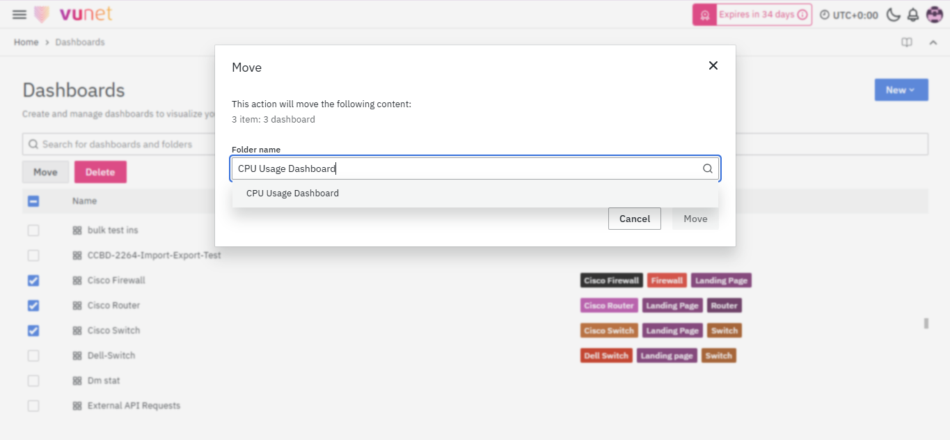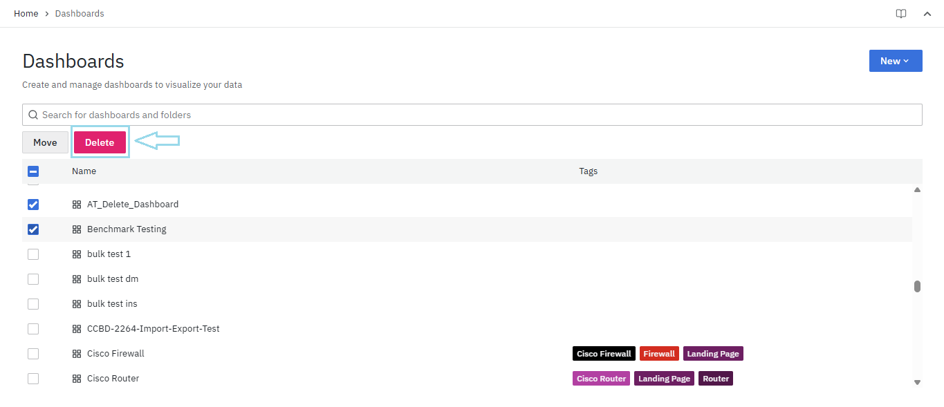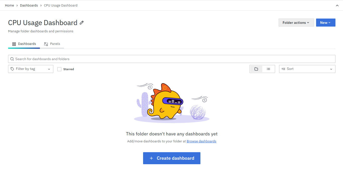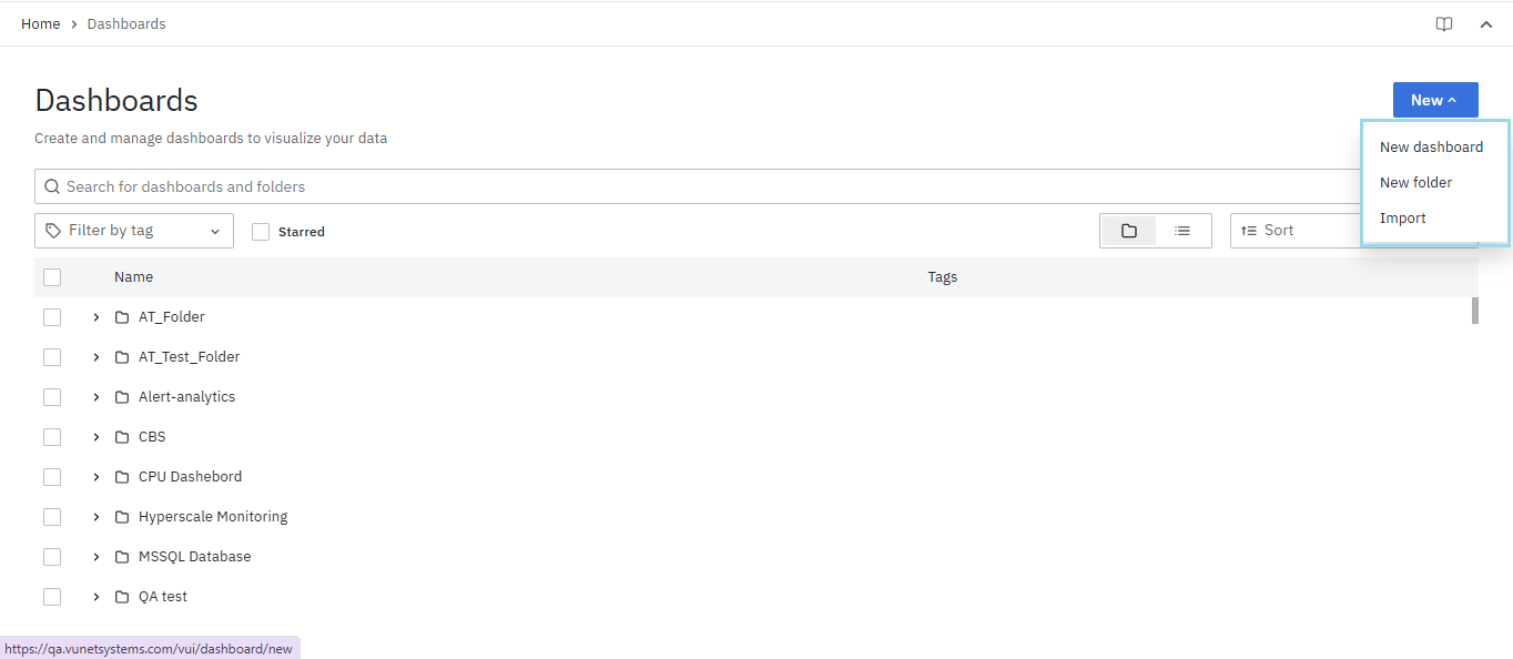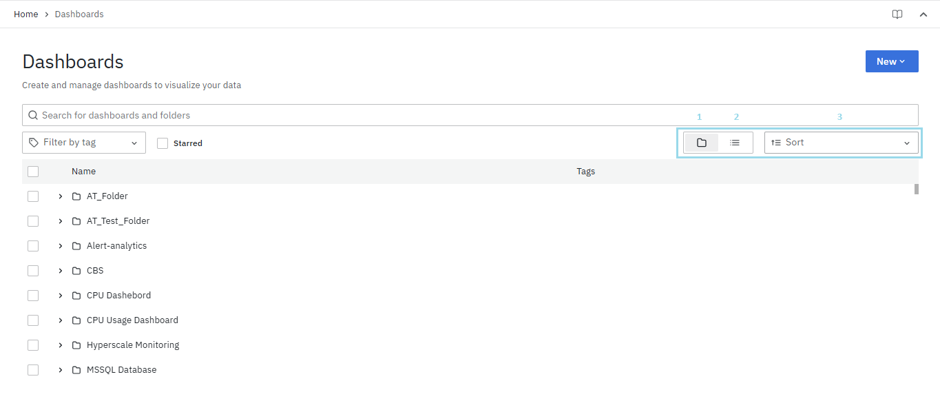 - Dashboards: You can use Dashboards to browse through the dashboards and perform operations such as list, delete, new folder, import, etc.