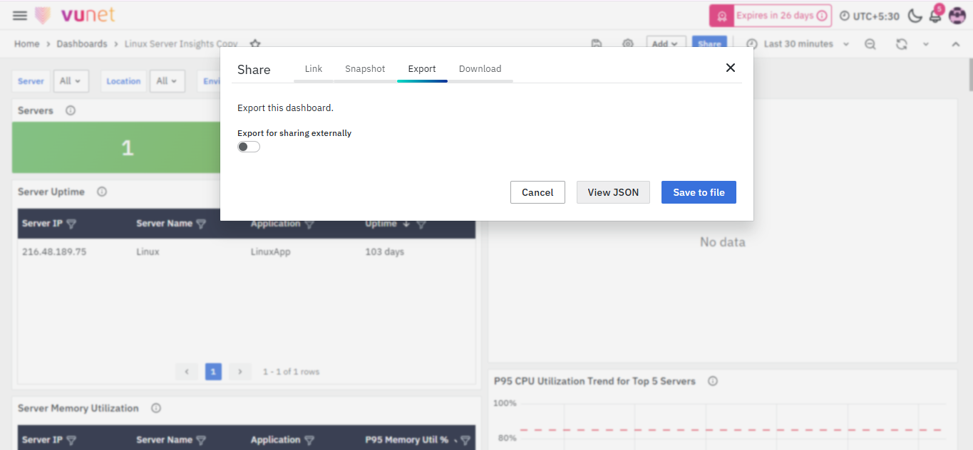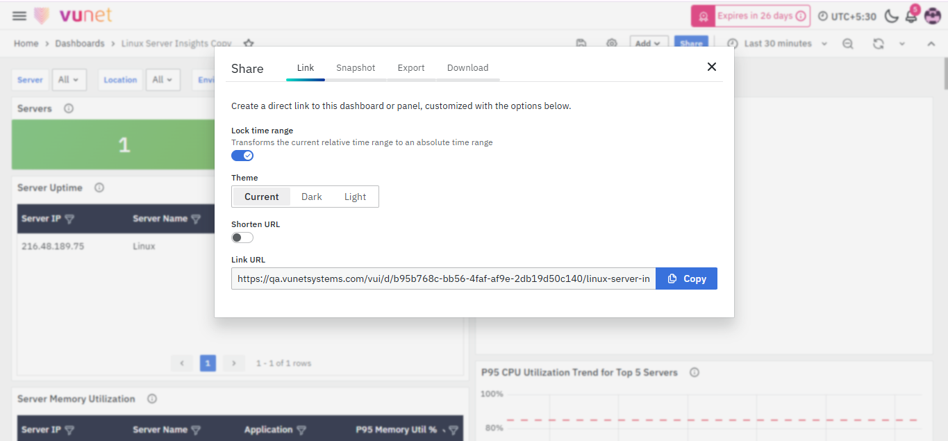 Create direct, customized links to your dashboards or panels. Lock time ranges and choose themes (Current, Dark, Light) for consistent views. Easily copy and share links with authorized users or teams.