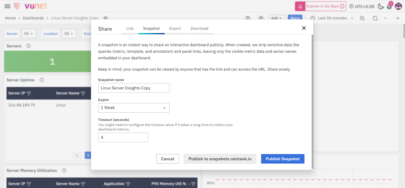 Generate interactive snapshots of dashboards or panels that remove sensitive query details, allowing secure public or internal sharing. Snapshots can be named, set to expire after a configurable duration, and published locally or externally.