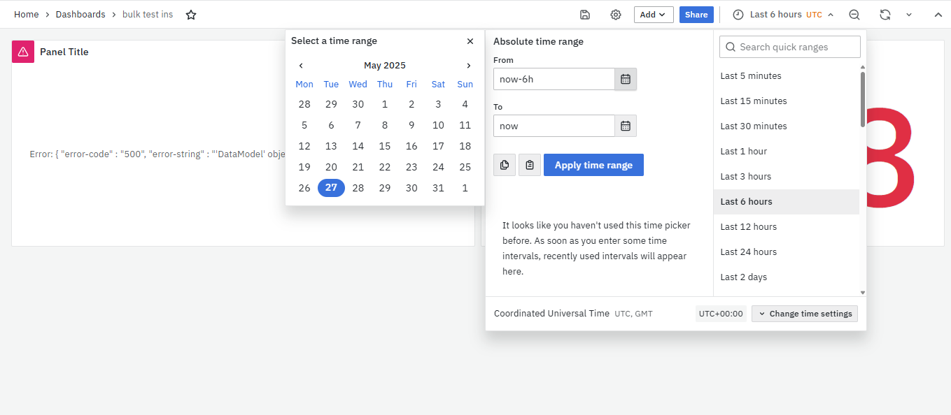 - You can type exact time values or relative values, such as now-24h, and then click Apply time range.