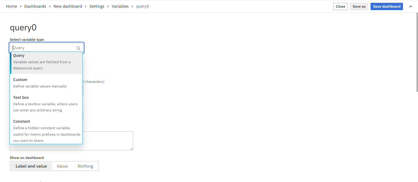 Constant Constant variables allow you to define a fixed value that remains unchanged throughout the dashboard. These are especially useful when you want to embed a static value, such as a metric prefix, environment ID, or path, in multiple queries without having to repeat it each time.