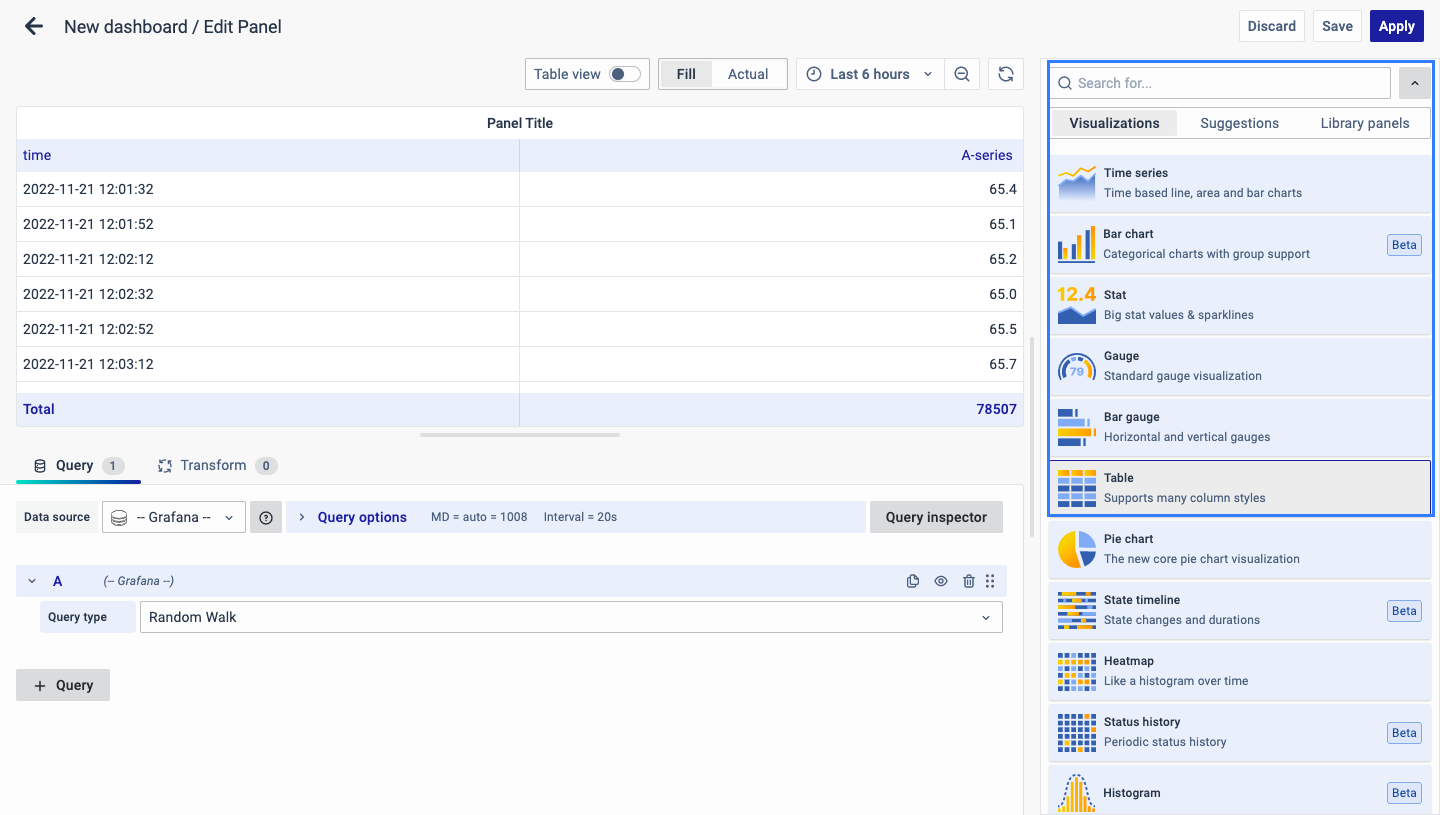 On the right side of the default screen, select Visualization as Table to create a Data Table panel.