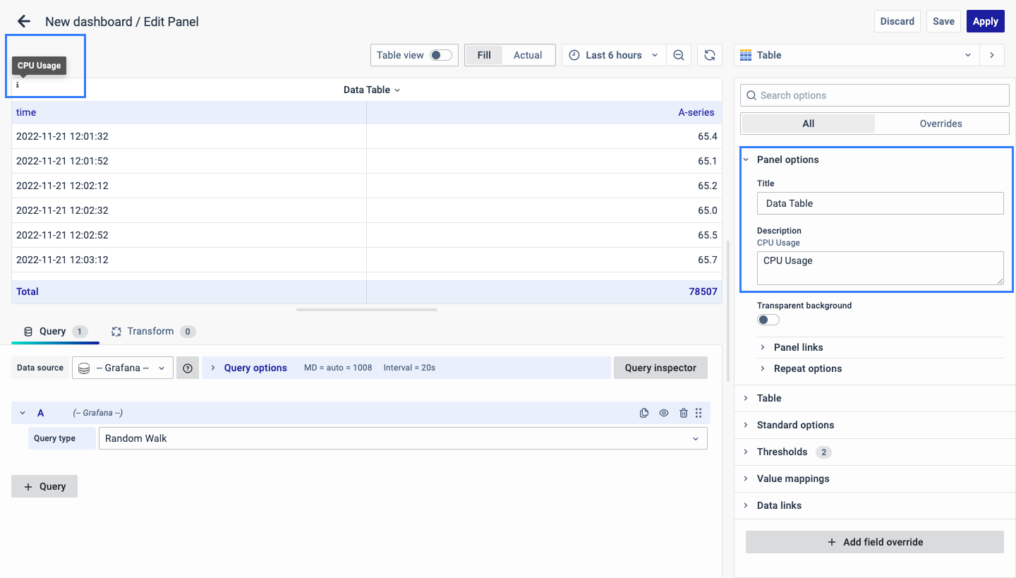 There are multiple options to edit the properties of the panel. The first one is Panel Options. Enter a Name and Description for the Panel that you want to create. For instance, if you're making a Data Table to track CPU usage, name the panel "Data Table" and describe it as "CPU Usage."