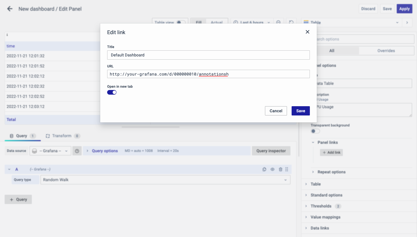 The URL can be a link to another dashboard or for getting help or useful info. When you click on a panel, it opens the link either in the same tab or a new tab, depending on your choices. For example, if you want to compare a default dashboard, just click the link to open it.