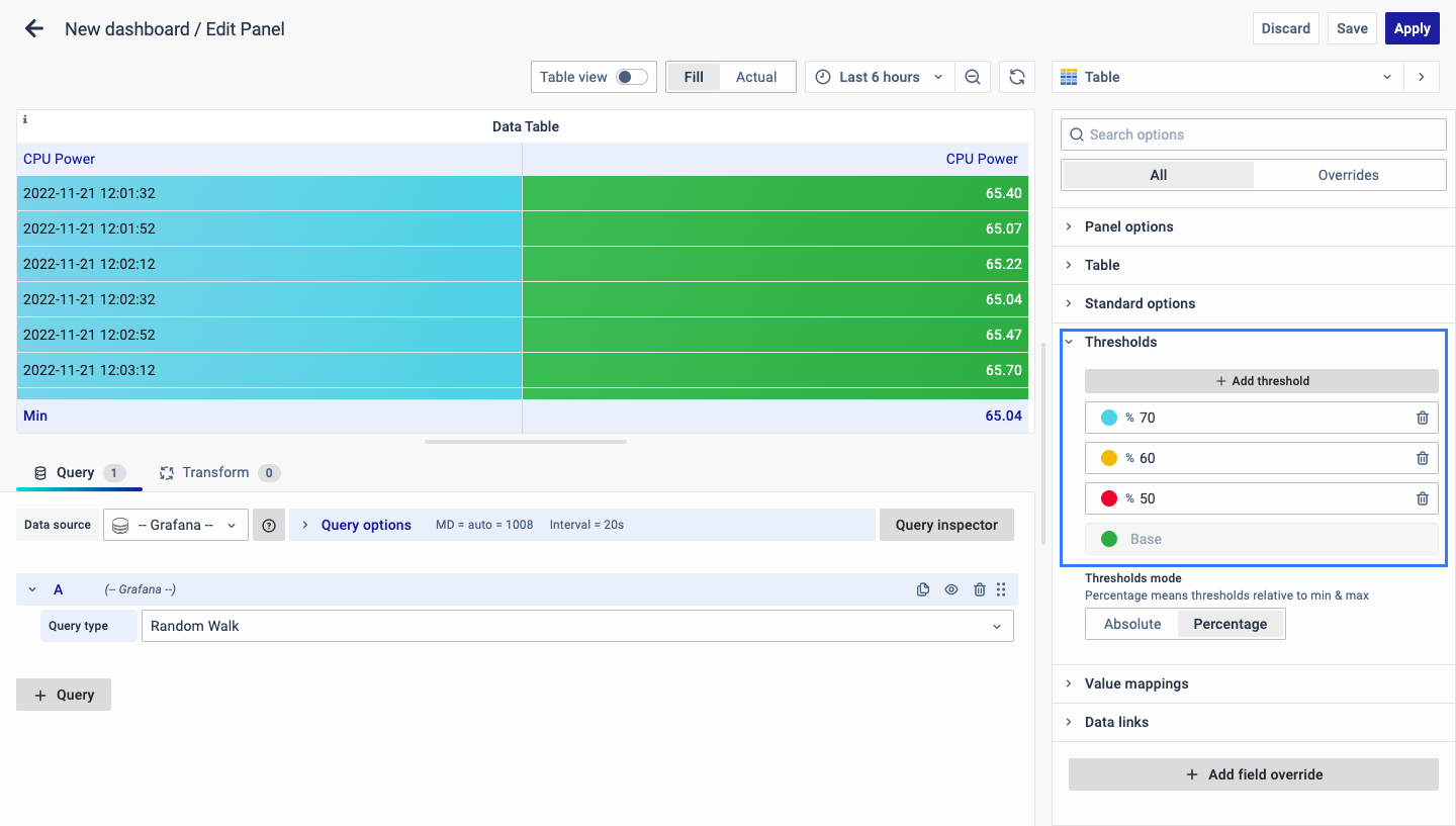 - Use Thresholds to define value limits and apply color coding.