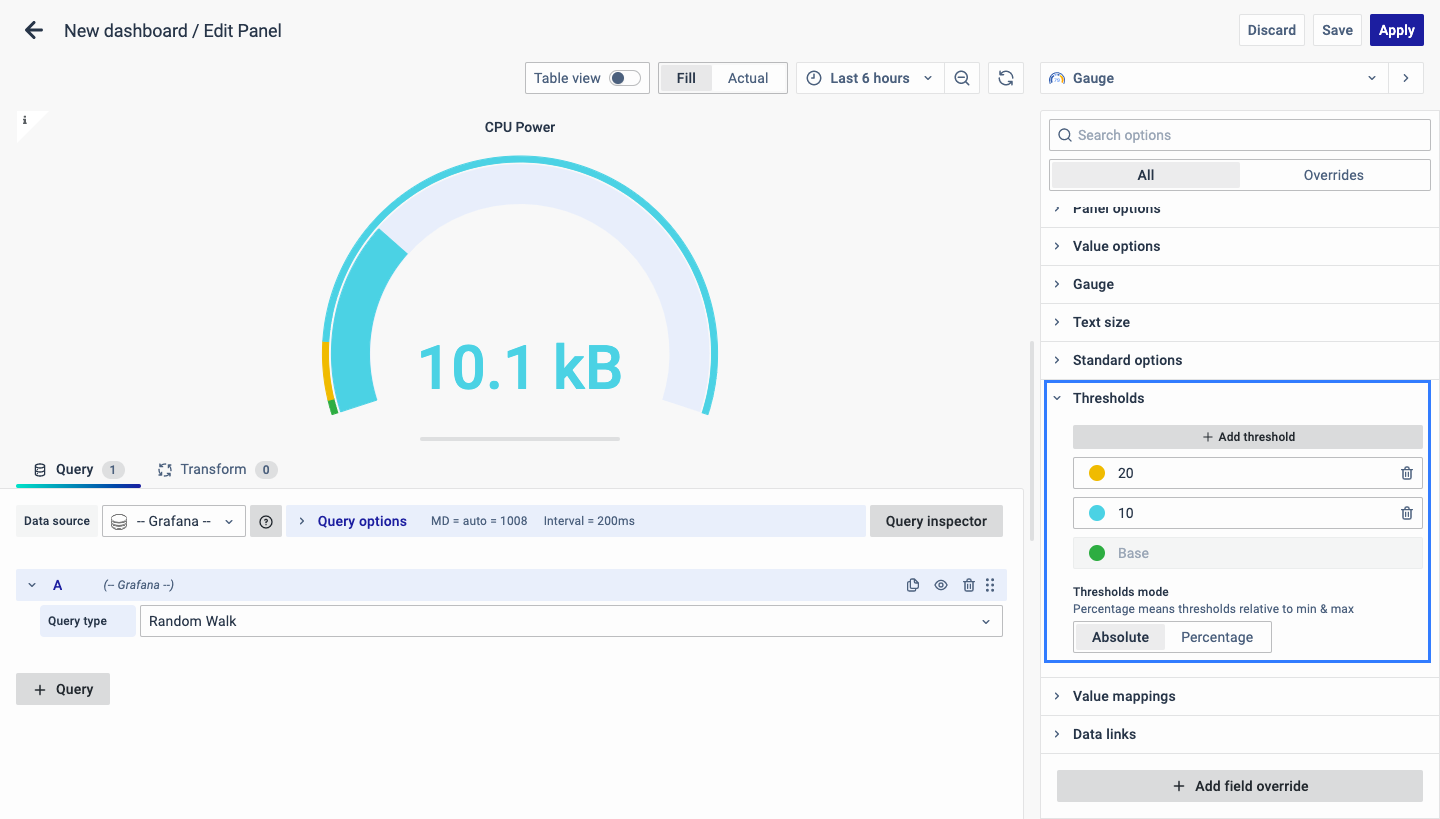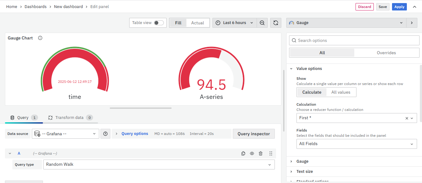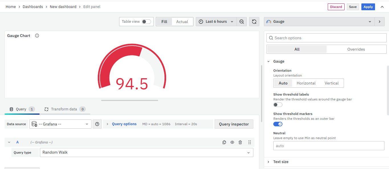 On the right side of the default screen, select Visualization as Gauge to create a Gauge Chart panel.