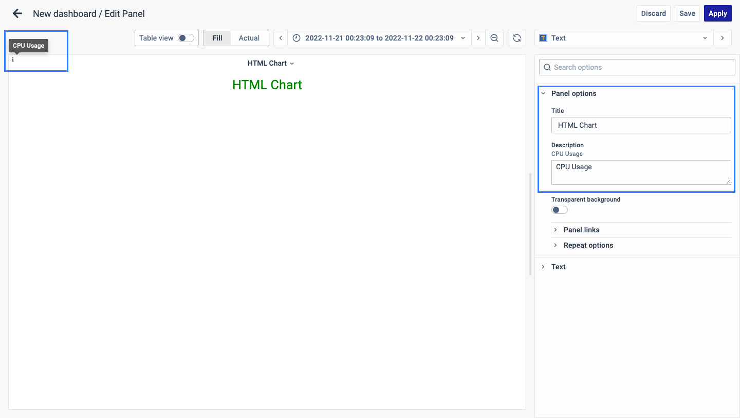 There are multiple options to edit the properties of the panel. The first one is Panel Options. Enter a Name and Description for the Panel that you want to create. For instance, if you're making an HTML chart to track CPU usage, name the panel "HTML Chart" and describe it as "CPU Usage."