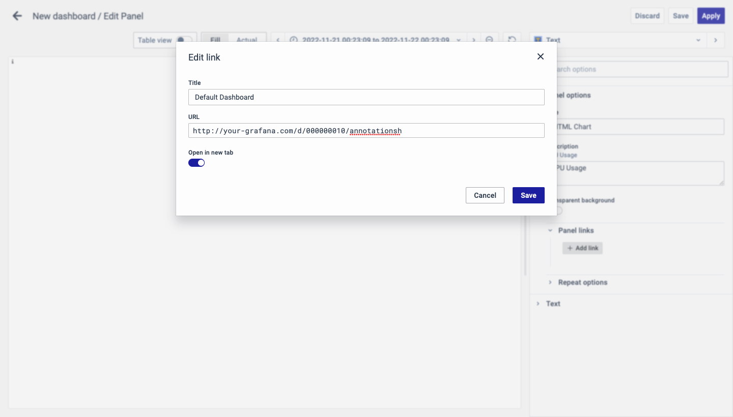 The URL can be a link to another dashboard or for getting help or useful info. When you click on a panel, it opens the link either in the same tab or a new tab, depending on your choices. For example, if you want to compare a default dashboard, just click the link to open it.