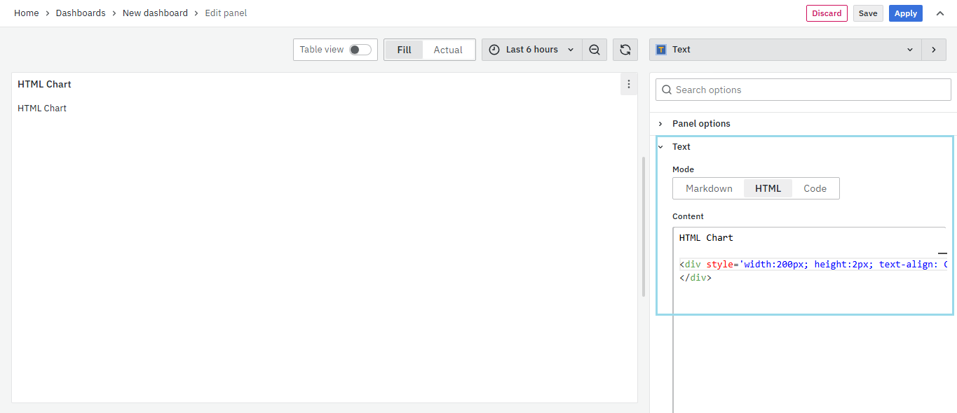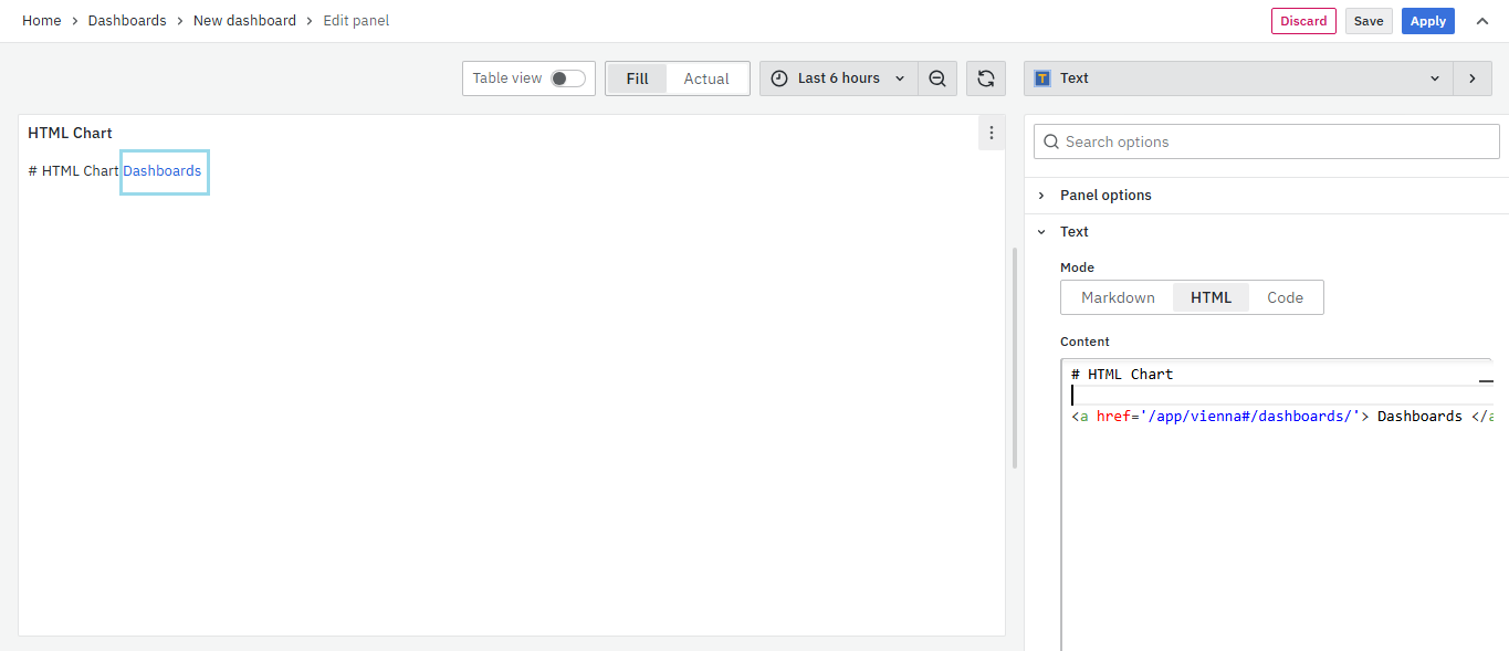 On the right side of the default screen, select Visualization as Text to create an HTML panel.