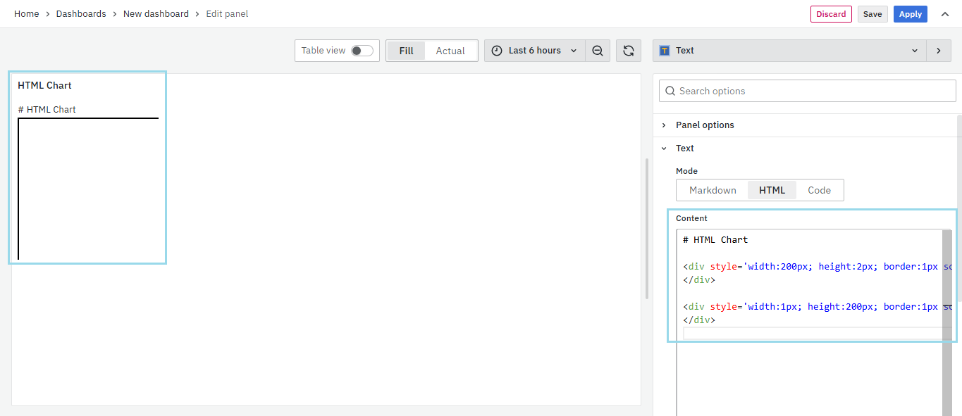 On the right side of the default screen, select Visualization as Text to create an HTML panel.