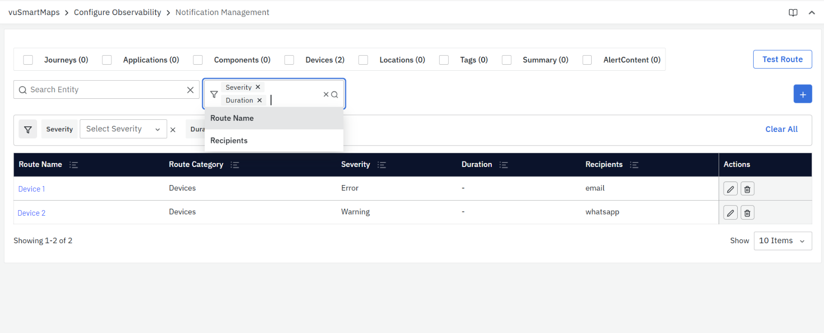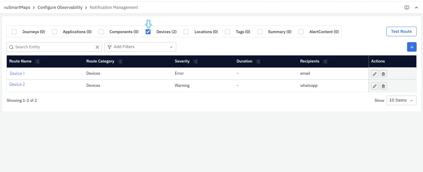 - Test Route: Click on this to test if the notification route functions as defined.