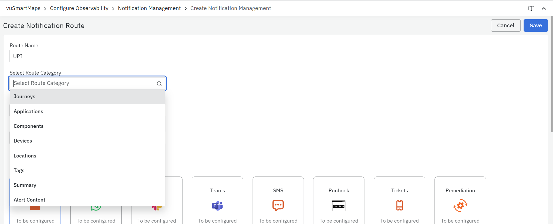 Notification Management provides a centralized way to configure how alert notifications are delivered across different channels (e.g., email, Slack, MS Teams). Instead of configuring each alert rule individually, you can define notification routing policies that apply broadly based on categories like journeys, devices, or alert severity. This helps reduce repetitive setup, ensures consistent notification delivery, and simplifies large-scale alerting workflows.