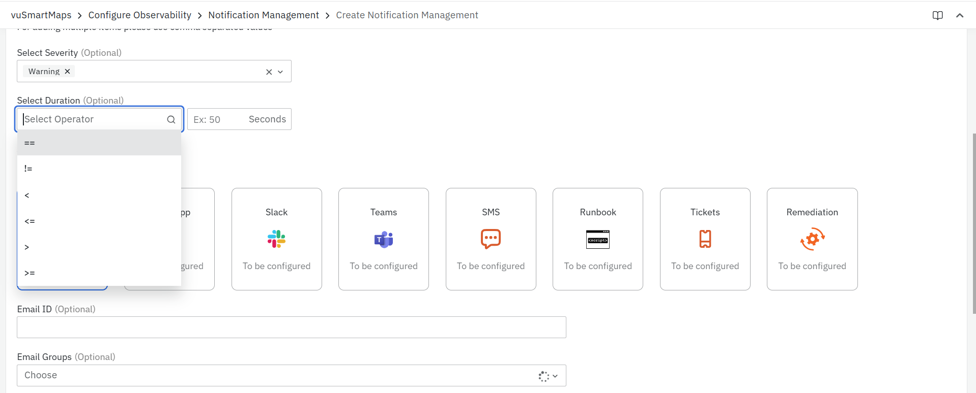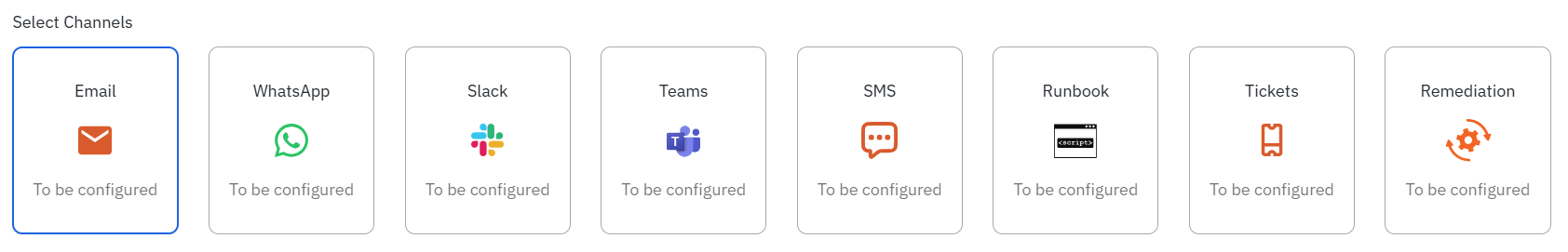 Step 8: ‘Select Channels’ allows you to manage how notifications are delivered. You can use email, WhatsApp, SMS, Runbook Automation, Slack, and MS Teams for communication. Configure recipients, groups, and message content to tailor alert content to your needs. This is similar to channel configuration in the Alerts.