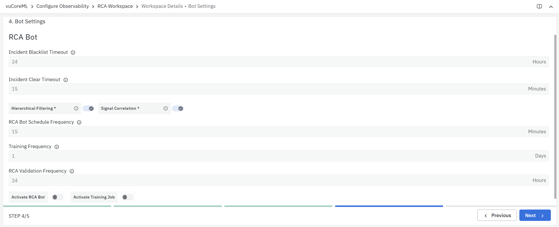 - RCA Bot Schedule Frequency: Sets the time intervals at which the RCA bot runs to detect abnormalities or incidents.