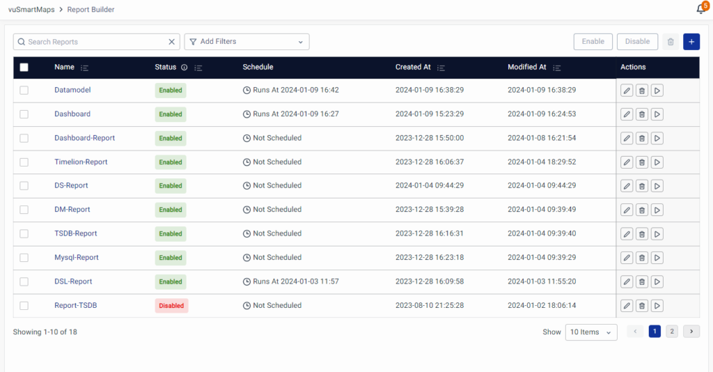 The Report Builder module within vuSmartMaps™ offers comprehensive capabilities for administrators to create and manage various reports, including long-term data storage reports. Users can conveniently access and manipulate report details such as name, status, schedule, and creation/modification time, and perform actions like editing, deleting, or generating reports directly from this interface.