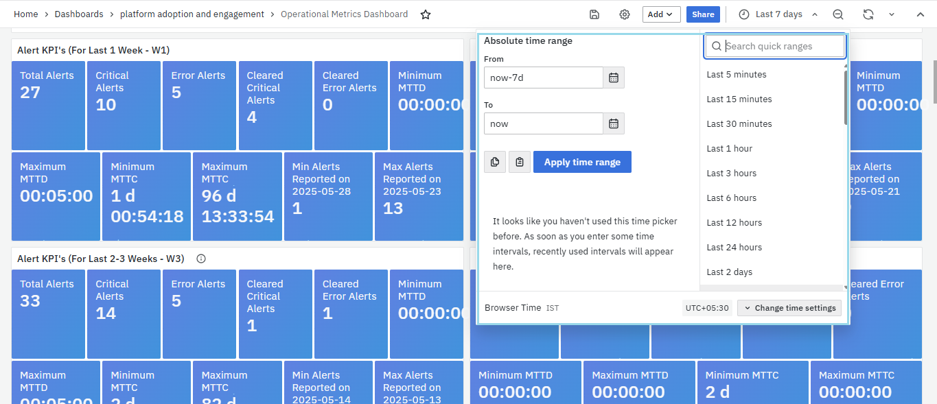 Selecting the appropriate time range for your analysis is crucial, and vuSmartMaps makes it easy. Within your dashboard, you'll find a time range selector typically located at the top right corner. Click on it to reveal a dropdown menu or calendar. From there, you can choose from predefined relative time ranges like "Last 30 minutes" or "Last 7 days," or set a custom absolute time range. Once selected, the dashboard will update automatically to display data within the specified time frame.