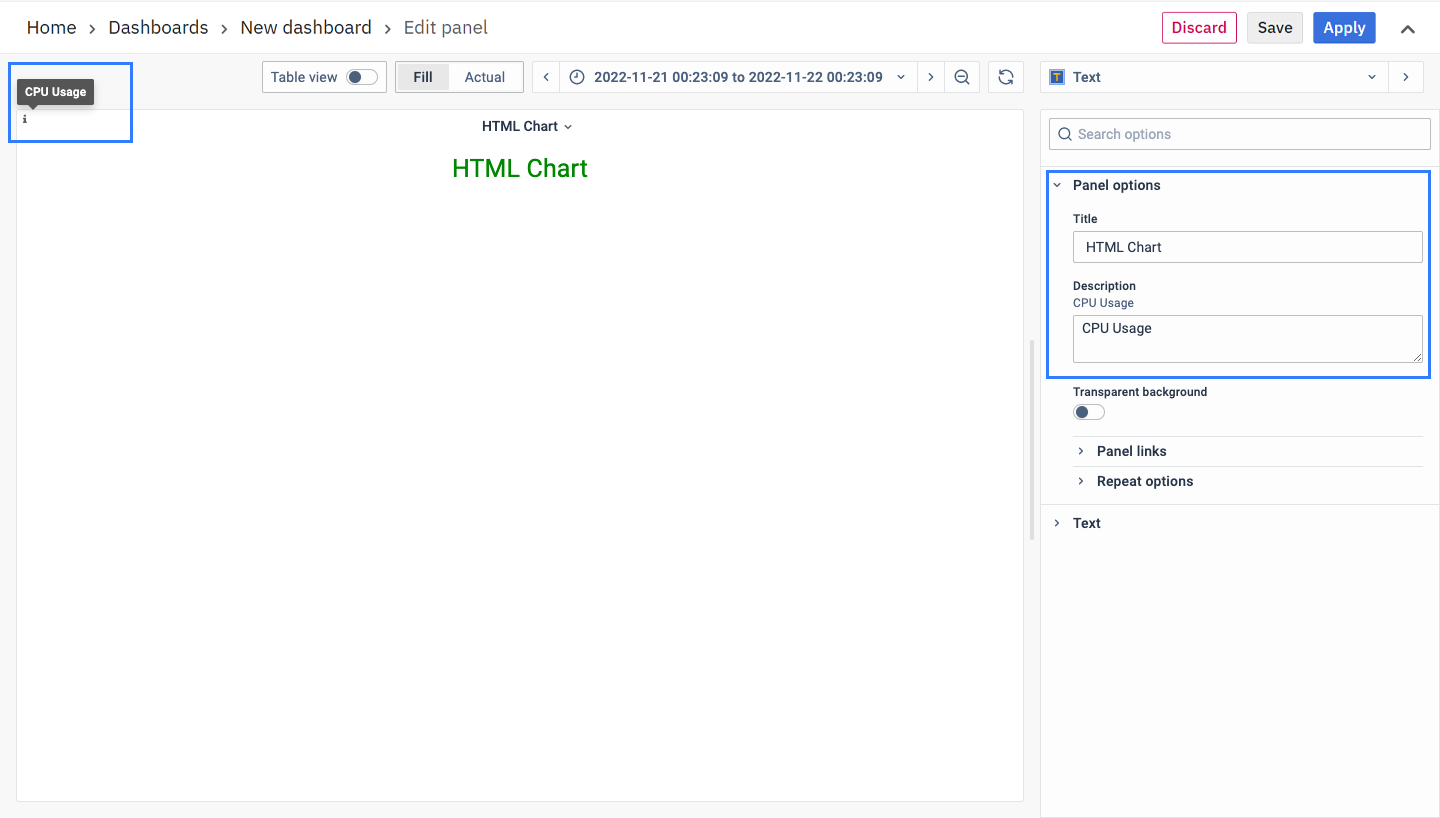There are multiple options to edit the properties of the panel. The first one is Panel Options. Enter a Name and Description for the Panel that you want to create. For instance, if you're making an HTML chart to track CPU usage, name the panel "HTML Chart" and describe it as "CPU Usage."