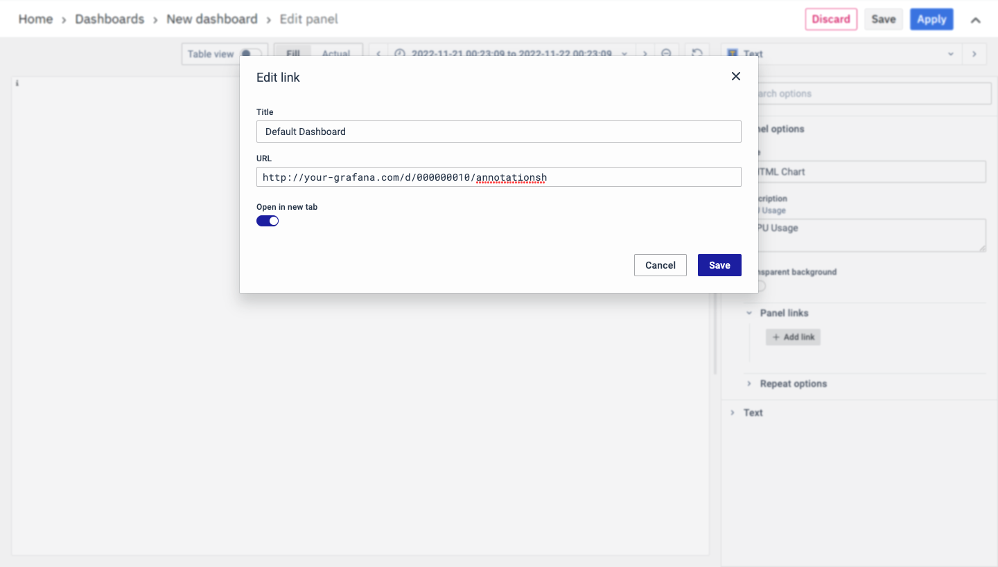 The next part of Panel Options is Panel Link where you can point a link to any other website or dashboard of your choice. Enter a title, and URL and select the ‘Open in new Tab’ option if you want to open the link in a new tab. Click Save.