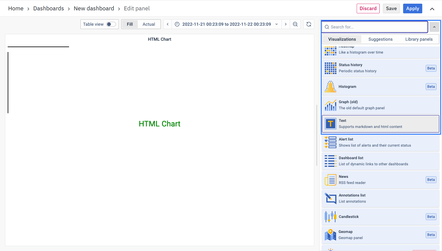 On the right side of the default screen, select Visualization as Text to create an HTML panel.
