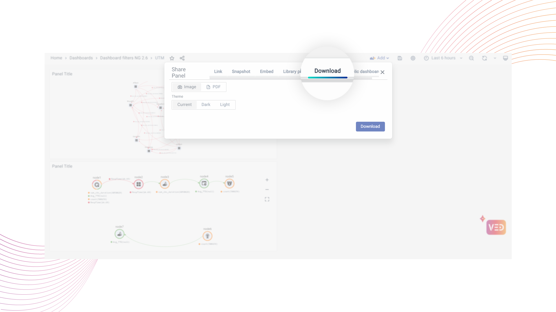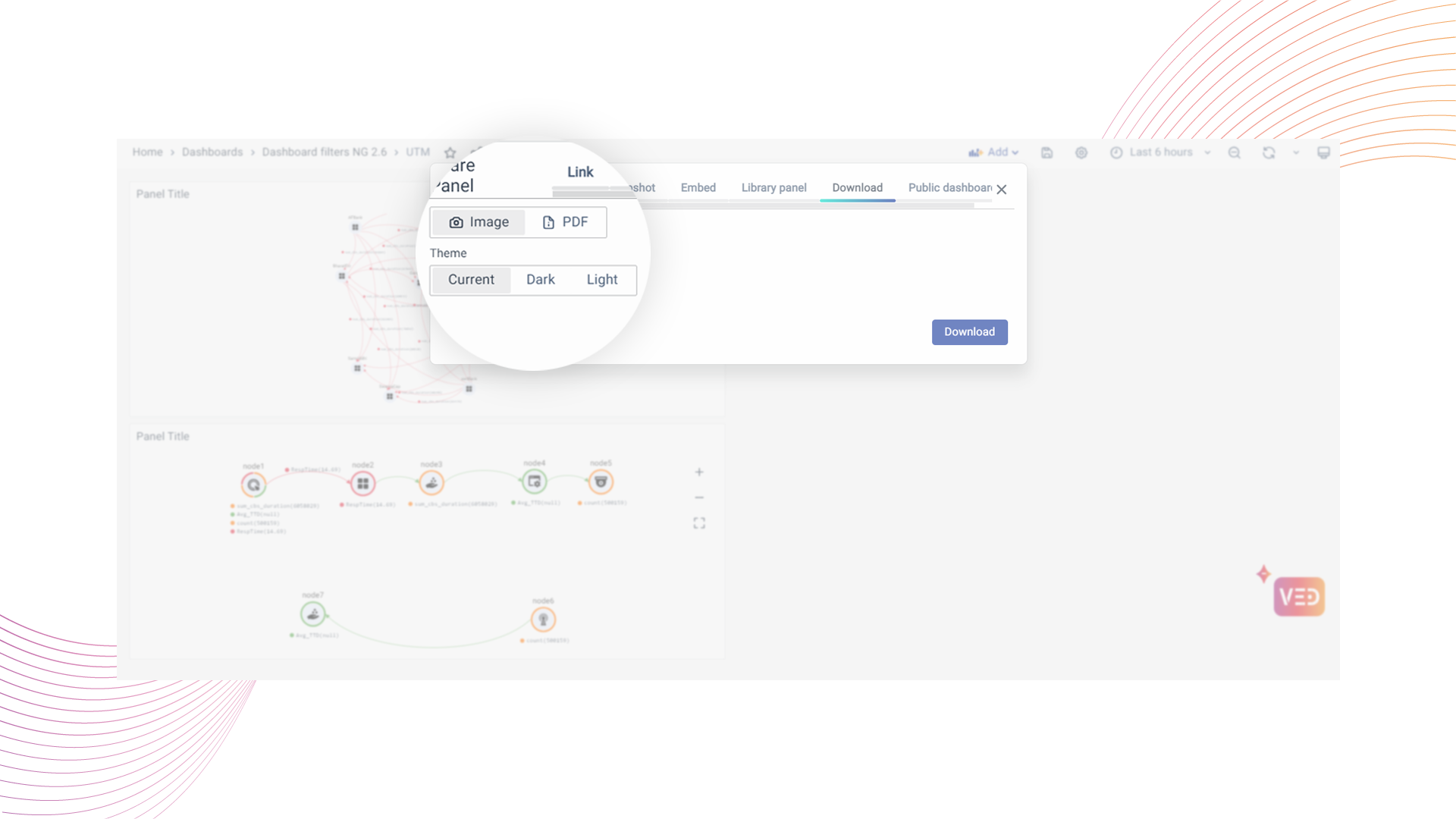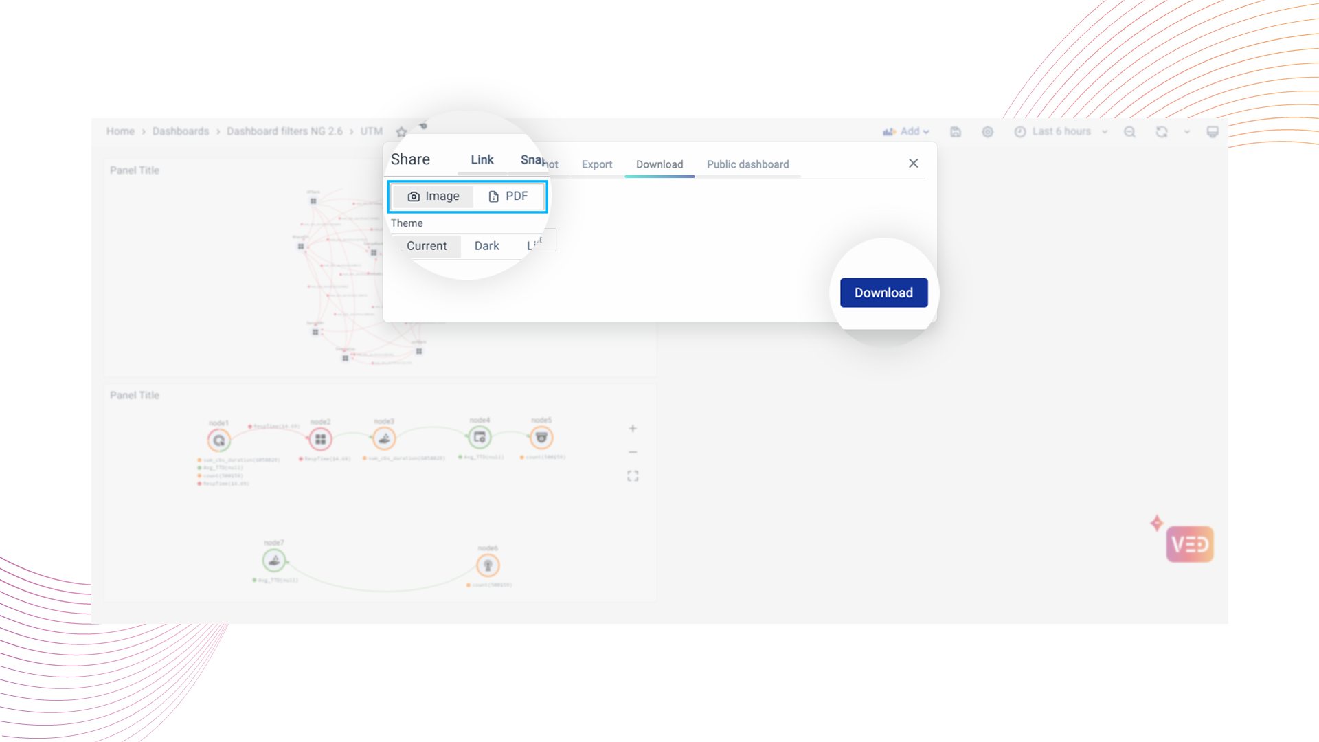 You can export the Dashboard or Panels into a PDF the same way you did when downloading the Image format. The only difference is to select PDF as the format in the download tab.
