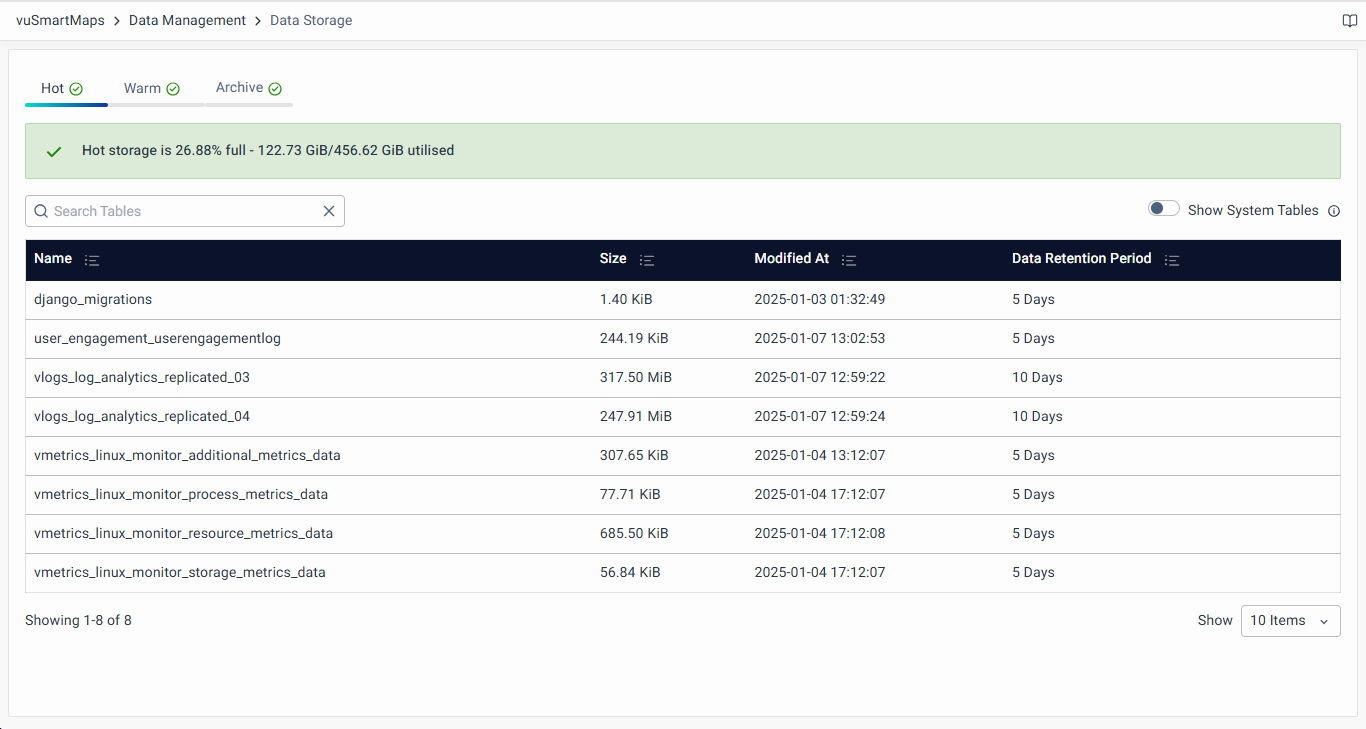 In the Hot, Warm, and Archived data storage tabs, you can find a list of available data tables in the Hot state, showing their name, size, last modified time, and data retention period. After the completion of this period, the data in the table will be removed/moved to other tiers, depending on the retention policy configured. Additionally, for each storage tab, memory utilization is displayed at the top, showing both the actual memory used and its percentage of the total available storage. This memory utilization is color-coded for clarity, with different thresholds for each storage state: