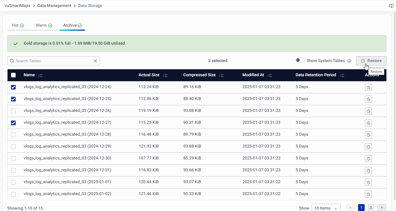 Use the Restore button in the Archived tab of the Data Storage module to move the data from Archived Storage to Warm Storage. Restored data will appear as restored-<table-name> in the Warm tab and will be retained for 7 days by default before permanent deletion.
