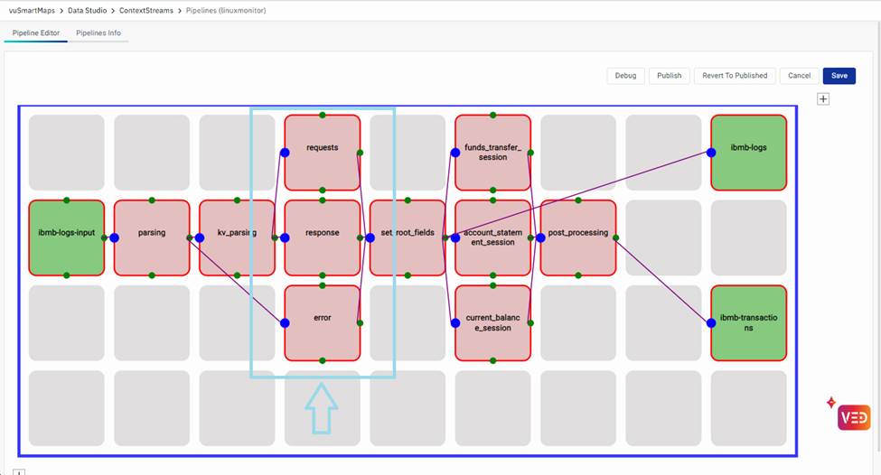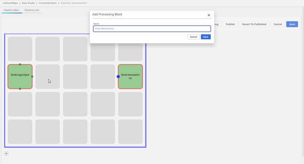 After configuring individual blocks and saving changes in the block editor, you'll be directed to the Pipeline Editor page. Here, you can seamlessly add more blocks. In vuSmartMaps, connecting blocks for efficient data flow is straightforward. Each block has four points: a blue point on the left for data reception, and green points on the right, top, and bottom for sending data to the next or branching blocks. Clicking and connecting these points ensures a seamless data progression, allowing users to create linear or branching configurations effortlessly. To connect blocks, click on the connection point of one block and then on the desired connection point of another block, creating a link between them.