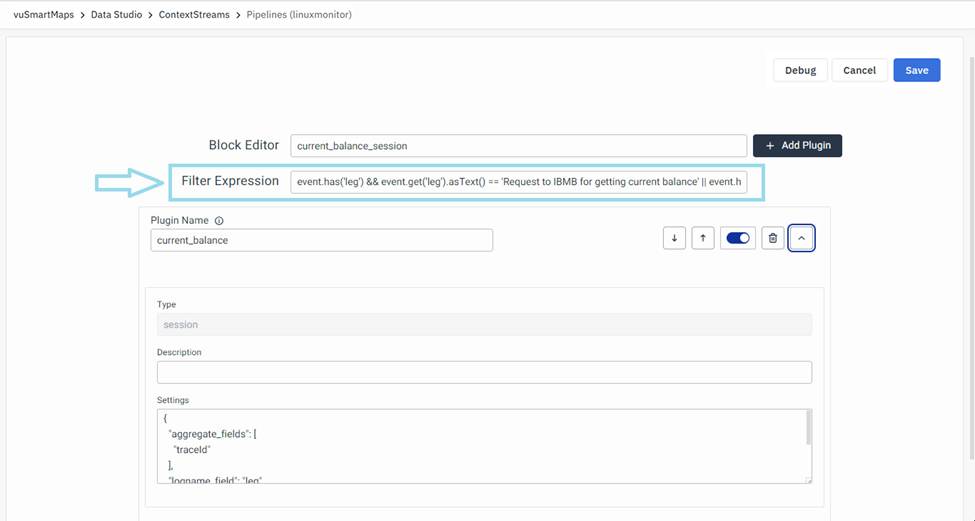 For instance, the following example illustrates a filter expression:event.has('leg') && event.get('leg').asText() == 'Request to IBMB for getting current balance' ||