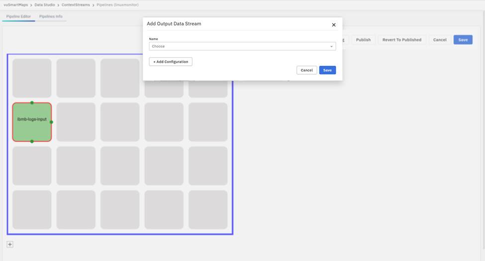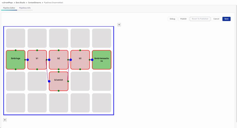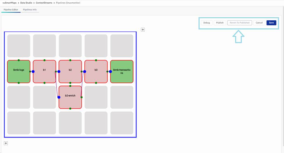 Save and publish your Data Pipeline on the Pipeline Editor page. Click Publish to activate and deploy your configured pipeline. If needed, revert to the previously published version or click on cancel to not save changes.