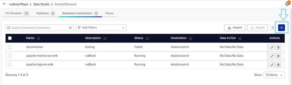 - On the ContextStreams UI page, navigate to the DataStore Connector tab. And click on the + button to initiate the creation of a DataStore Connector.