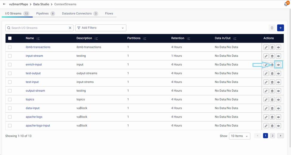 Click on the Preview Data button (available under the Actions column on the I/O Streams page) to preview the data in the particular I/O stream.
