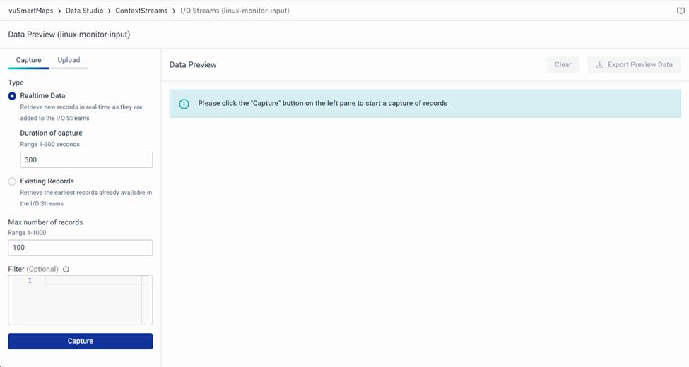 - Capture: This option allows users to preview the data within an I/O stream. Users can customize the preview by selecting specific data points, setting a timeout, and choosing the data type. Additionally, the user can export the previewed data as a JSON file using the "Export Preview Data" button.